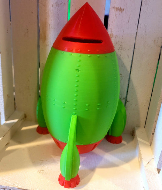 Retro Rocket Coin Bank – 3D Printed with Twist-Off Base (Green & Red)